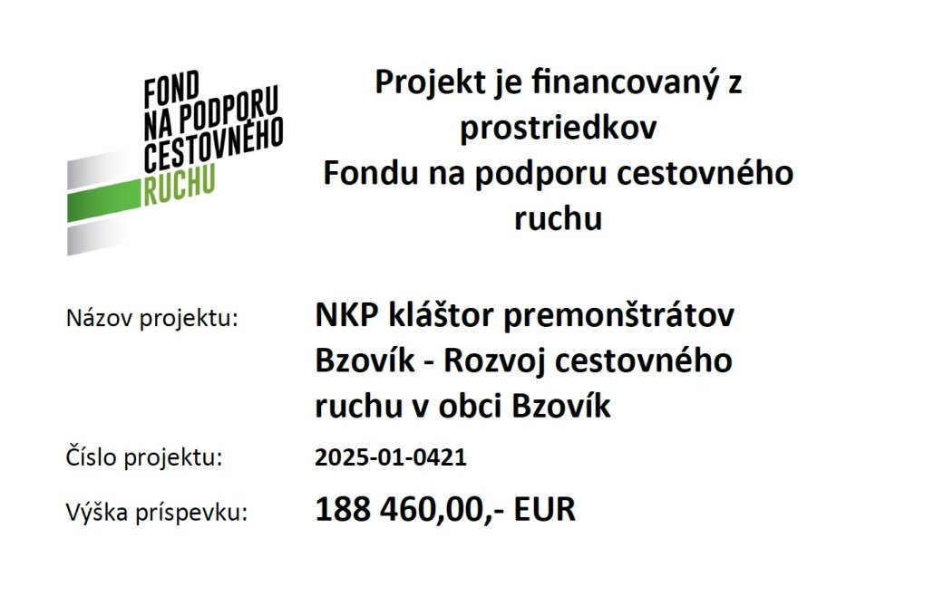 https://www.obecbzovik.sk/klastor-premonstratov-bzovik Otváracie hodiny hradu: 15.10. - 31.3. 08,00 - 15,30 1.4. - 14.10 08,00 - 18,00 Príspevok na údržbu a rekonštrukciu NKP Kláštor premonštrátov Bzovík môžete zaslať aj na číslo účtu obce Bzovík: SK56 0200 0000 0020 2138 7856 Priložené dokumenty